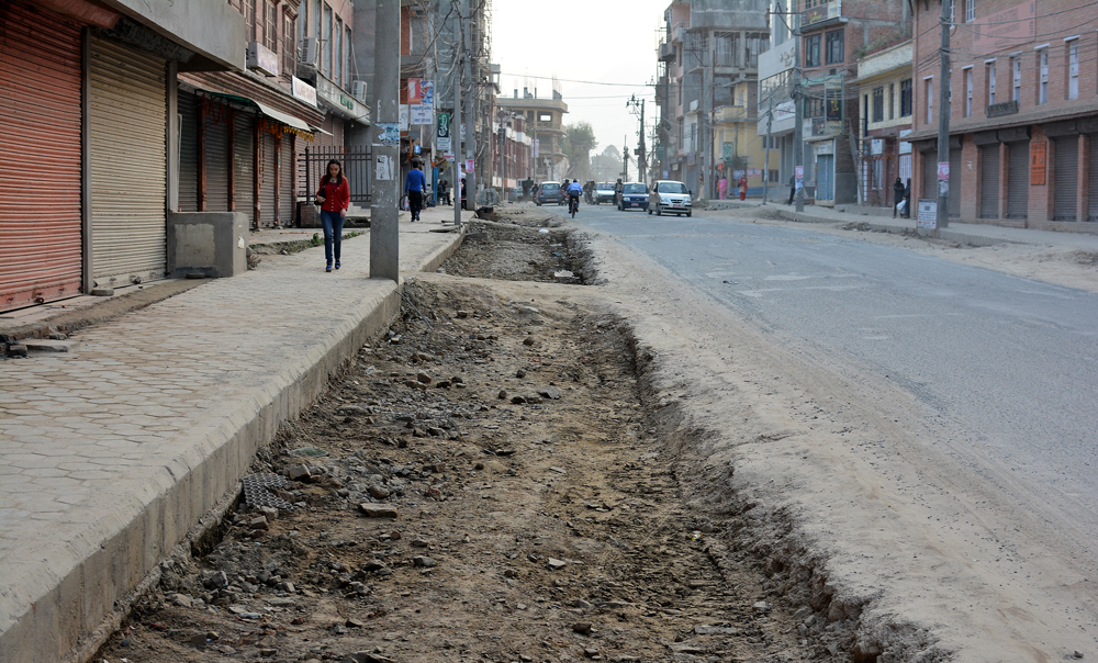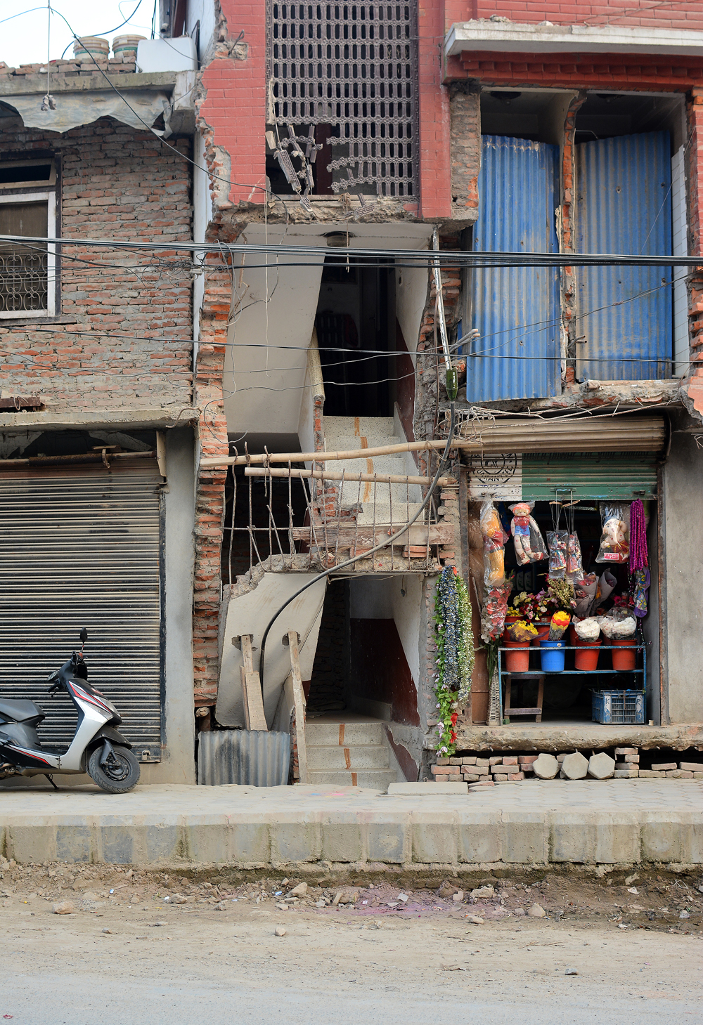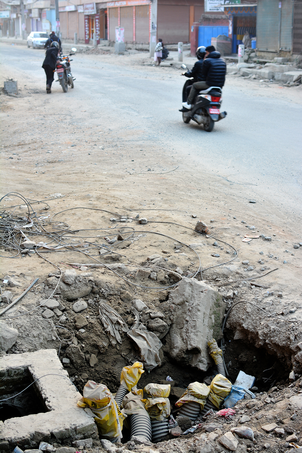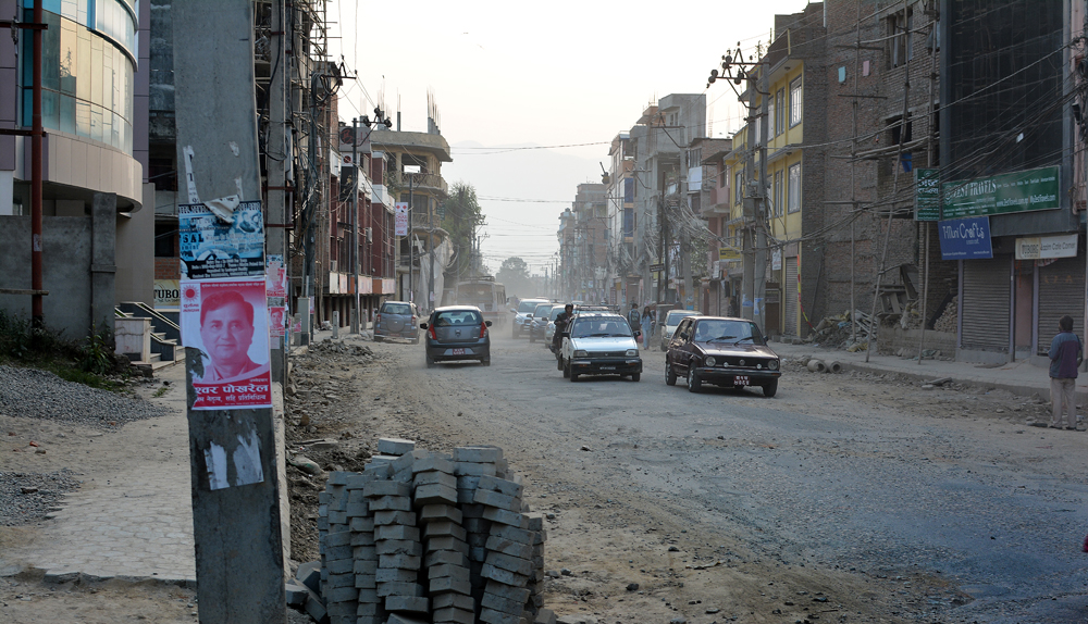 Die geschundenen Strassen der Stadt werden es den Maoisten danken, dass sie Kathmandu für ein paar Tage lahm legen. Ein bisschen autofreie Erholungszeit wird den löchrigen Pisten hier gut tun. Ein besonders übel zugerichtetes “Exemplar” habe ich auf meinem Nachhauseweg vom LOWA/Globetrotter-Interview in Lazimpat entdeckt. Das Road-Widening Project der Regierung ist hier noch im vollen Gange. Ziel des Projektes ist es, die Hauptstrassen der Stadt um ca. vier Meter zu verbreitern, damit sich die Blechlawinen ungestört durch die Quartiere ergiessen können und sich nicht mehr ewig lange stauen. Dazu wurden an verschiedenen Orten in der Stadt ganze Häuserzeilen abgerissen und bestehende Wohnblöcke demoliert. An manchen Stellen kann man den Leuten noch heute in die aufgerissenen früheren Wohnräume schauen.