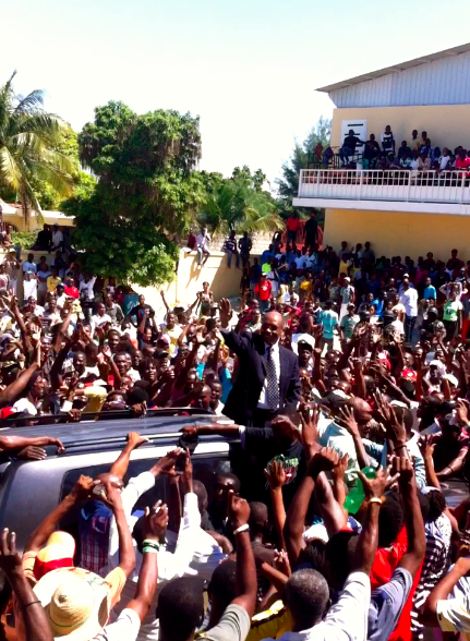 Vers 14 heures, un frisson s’empare de la foule. Plusieurs voitures font leur apparition dans l’enceinte du lycée. Et la foule comprend. Scène de liesse, les militants courent s’agglutiner autour des véhicules aux vitres teintées, tentent de deviner où se trouve leur chef d’orchestre charismatique. Lorsque Jean-Bertrand Aristide sort de sa voiture, c’est comme une star de rock’n roll qu’il est ovationné.